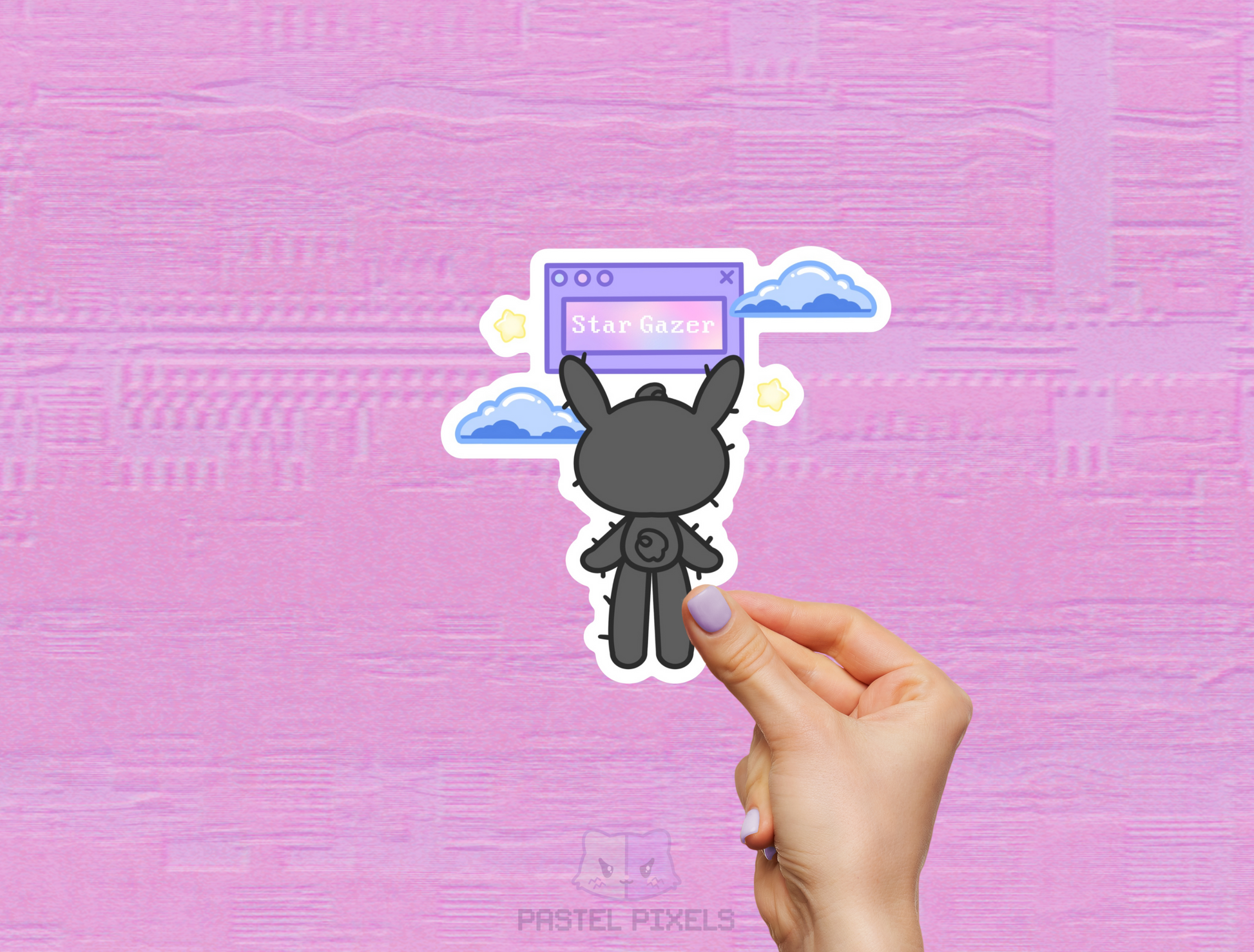 Eyes lifted toward the night sky, Haze can't help but wonder if the stars hold the answers. This sticker shows Haze gazing up at the clouds and constellations, framed by a computer window labeled Stargazer.