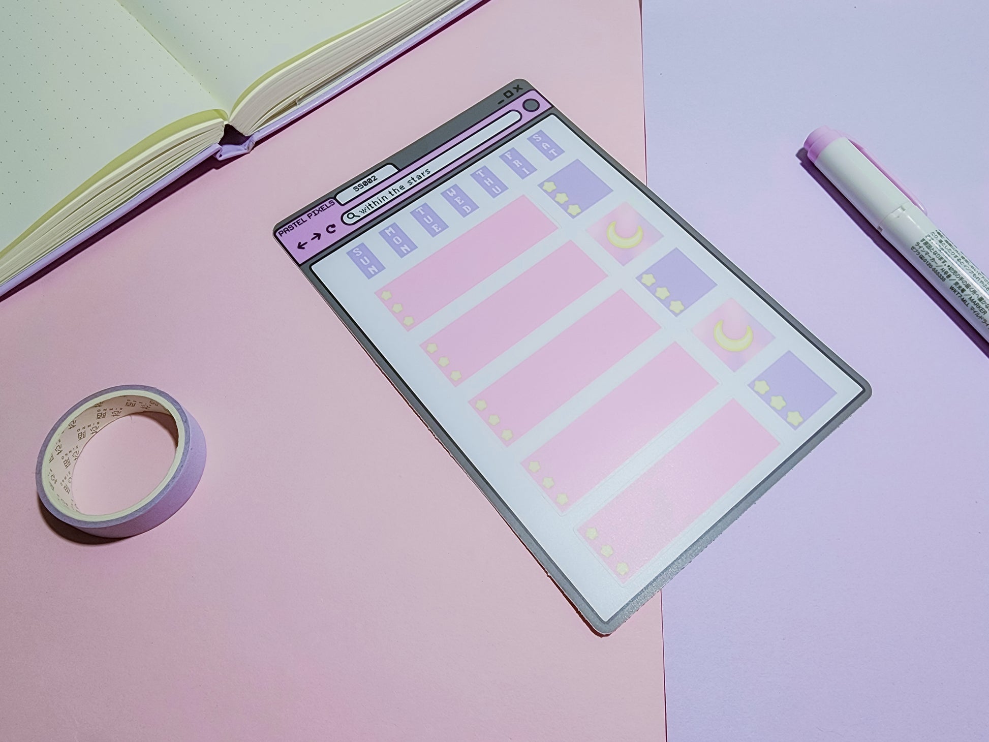 Includes stickers to write down your to-do lists, decorate with a pastel background of a moon, and Sunday through Saturday tiny labels.